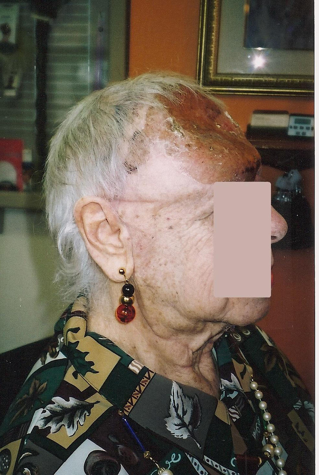 | Cliente, après une chirurgie; où la partie frontale du crâne a due être retirée |